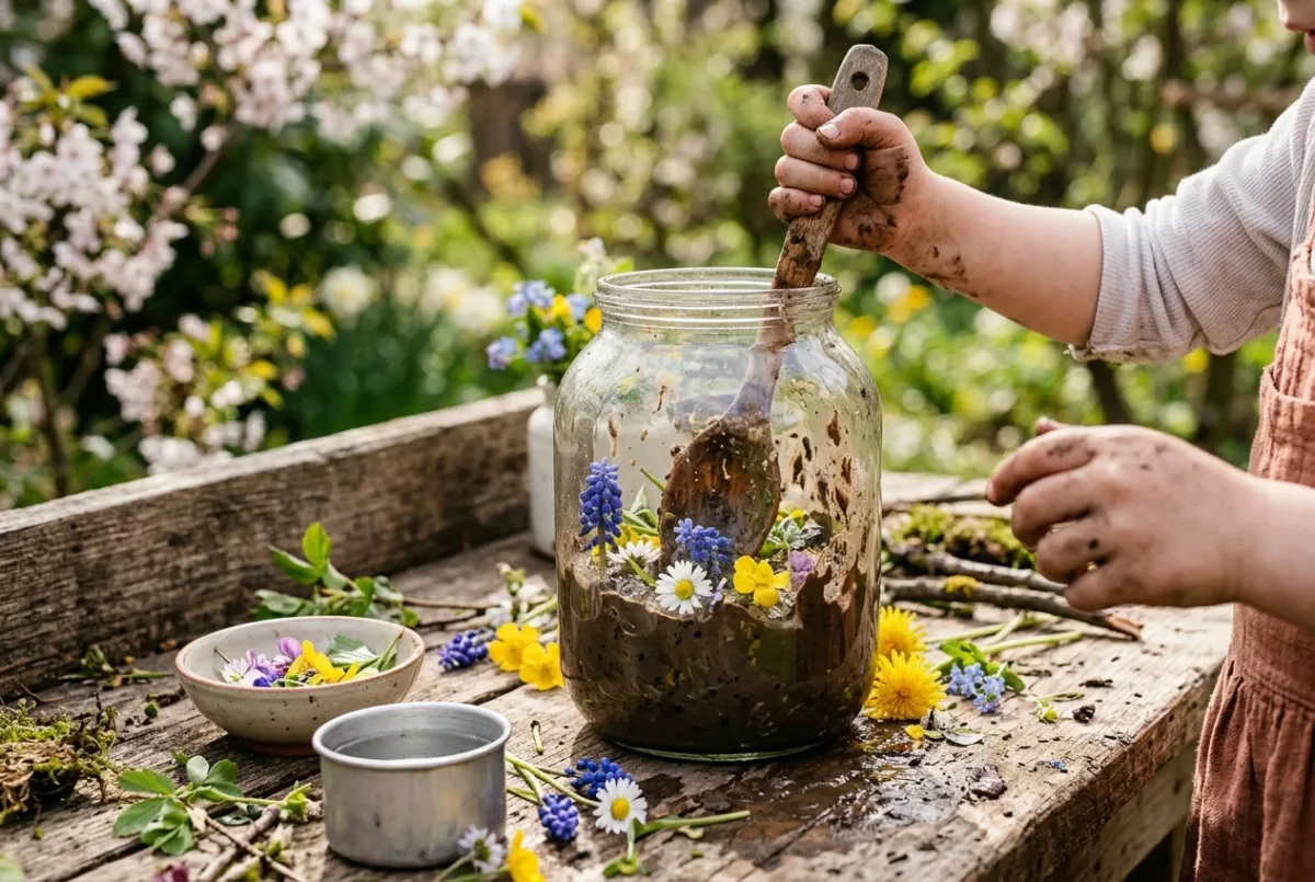 Preprosta igra z blatom, vodo in pomladnim cvetjem otroke zaposli za ure, hkrati pa skozi naravno raziskovanje krepi motoriko in domišljijo.